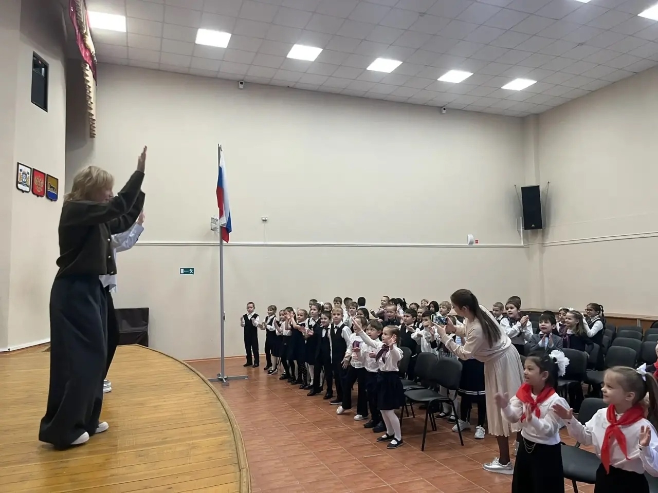 Волонтеры из отряда «Открытые Сердца» провели танцевальную зарядку для первоклассников и учителей.