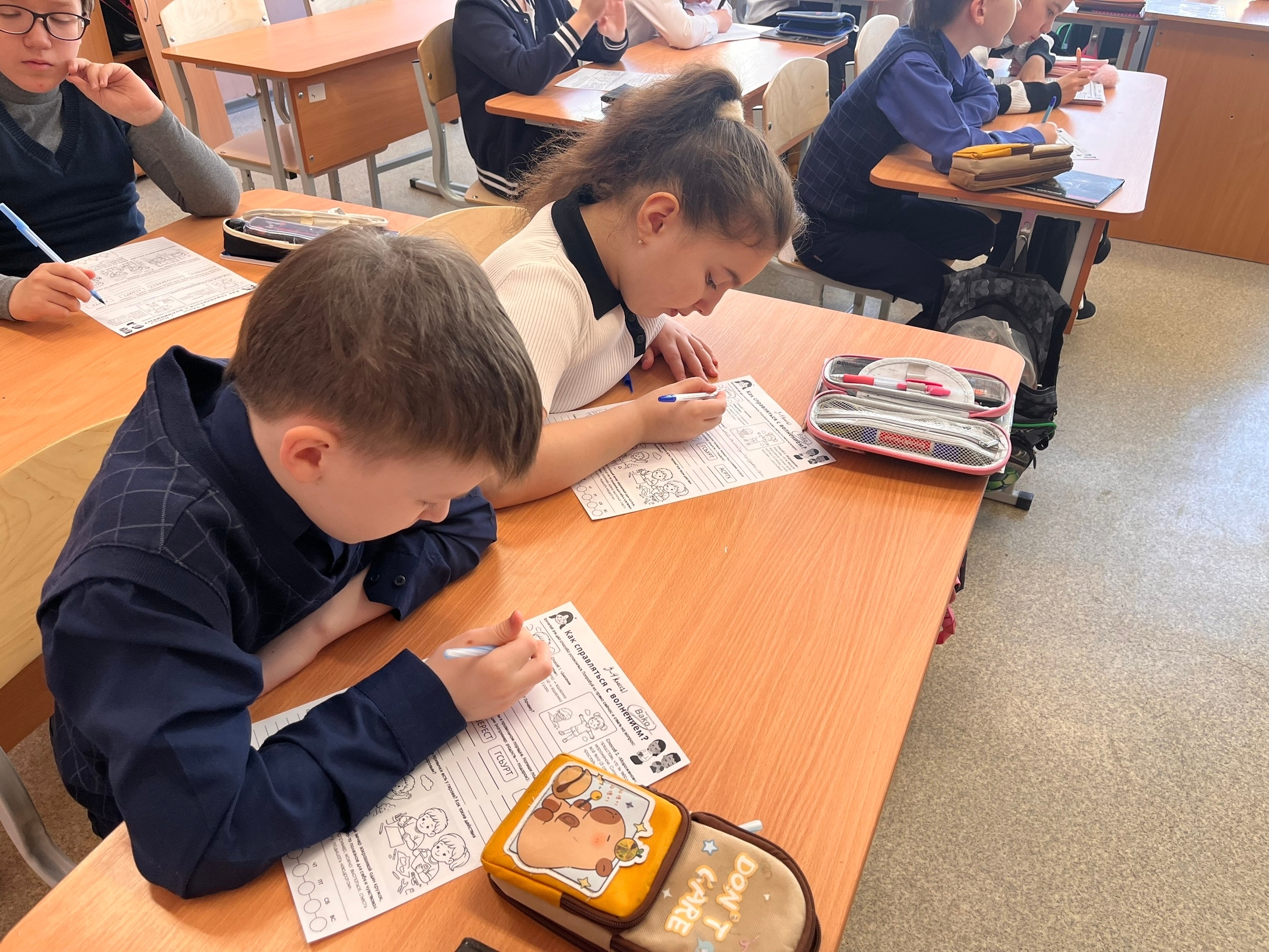 В ходе занятий обучающиеся обсудили, что волнение — это естественное состояние человека перед важными событиями. Ребята познакомились с техниками саморегуляции, которые помогают справляться со стрессом, развивать эмоциональный интеллект и лучше понимать свои чувства.