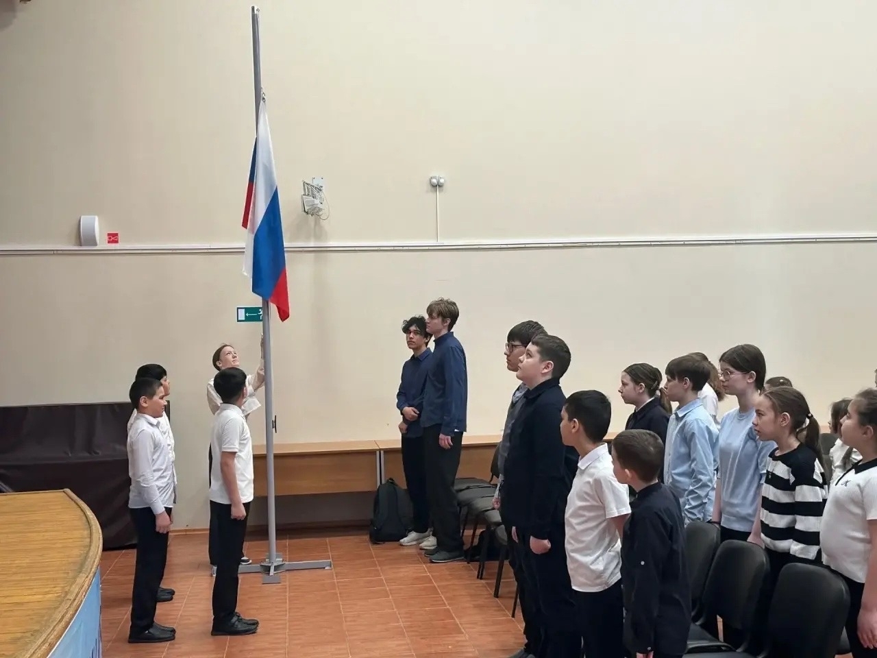 Понедельник в нашей школе начался с традиционной церемонии поднятия Государственного флага Российской Федерации.
